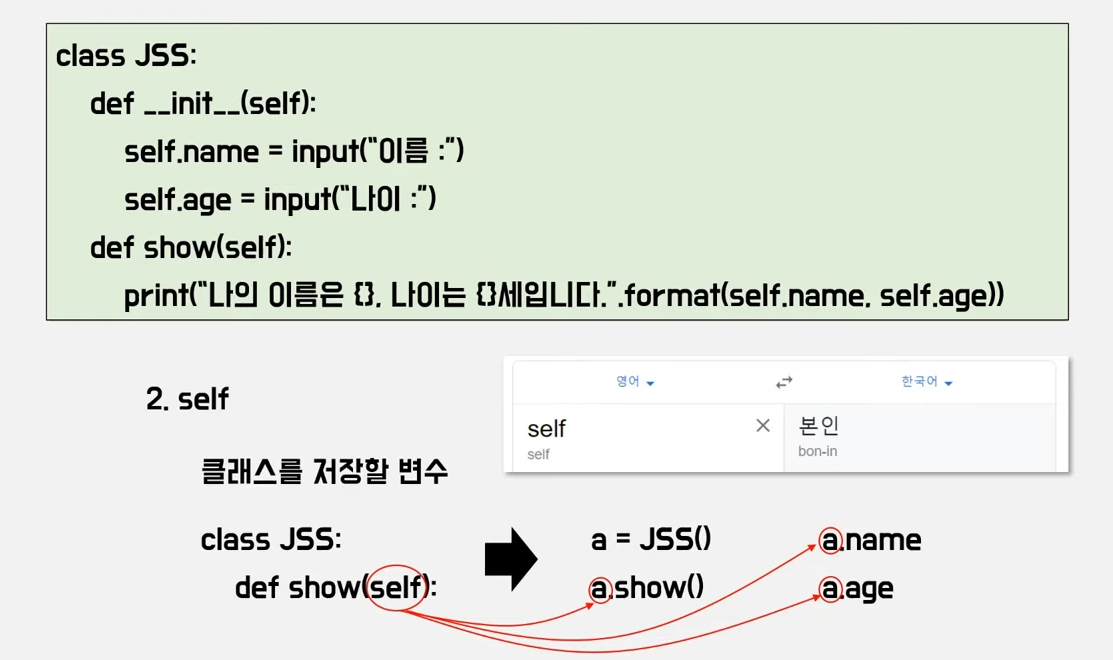 1. self는 class를 지정한 변수를 나타냄.(즉, self=class)