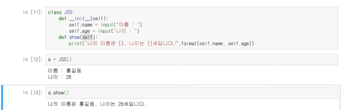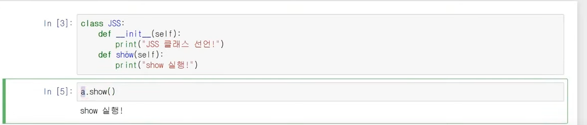 2. a.show() 에서 볼 수 있듯이 ()속을 빈칸으로 두는 것을 볼 수 있는데, 이는 괄호 속 self대신 앞에 a. 로 입력 되었기 때문이다.