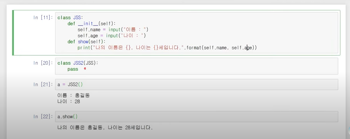 JSS2를 JSS와 같은 기능을 하도록 그대로 쓰고자 한다면, 위쪽처럼 class JSS2(JSS)로 선언 후 pass 하게 되면 그 아래 내용처럼 JSS2를 실행했을때 JSS와 같은 기능을 하는것을 확인할 수 있다.